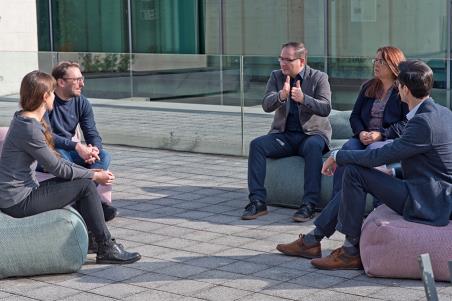 Im Bild (Foto Alexander Erlacher - unibz) von links nach rechts: Francesca Brunet, Joachim Gatterer, Oswald Überegger, Siglinde Clementi, Karlo Ruzicic-Kessler.