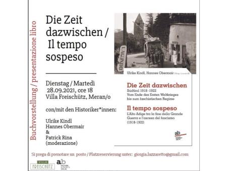 Am Dienstag, dem 28. September um 18.00 Uhr, findet im Garten der Villa Freischütz in Meran die Buchpräsentation „Die Zeit dazwischen. Südtirol 1918 – 1922. Vom Ende des Ersten Weltkrieges bis zum faschistischen Regime“ statt. Der von Ulrike Kindl und Hannes Obermair herausgegebene Band vereint eine Reihe von Aufsätzen zu der Zeit des Übergangs unmittelbar nach dem Kriegsende 1918 bis zur faschistischen Machtergreifung. Zu Gast sind die beiden Herausgeber*innen und Historiker*innen, es moderiert der ORF-Journalist Patrick Rina, der auch die Interviews im Buch realisiert hat.