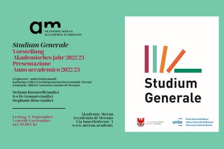 Auch in diesem Jahr arbeitet das Studium Generale der Freien Universität Bozen wieder mit der Akademie Meran zusammen. Die Vorstellung des akademischen Jahres 2022/23 findet am 9. September um18.00Uhr in den Räumlichkeiten der Akademie Meran statt. Die Verantwortliche des Studium Generale, Prof. Stefania Baroncelli und weitere Professor*innen der Freien Universität Bozen stellen den Aufbau des Studiums sowie ausgewählte Lehrveranstaltungen vor.